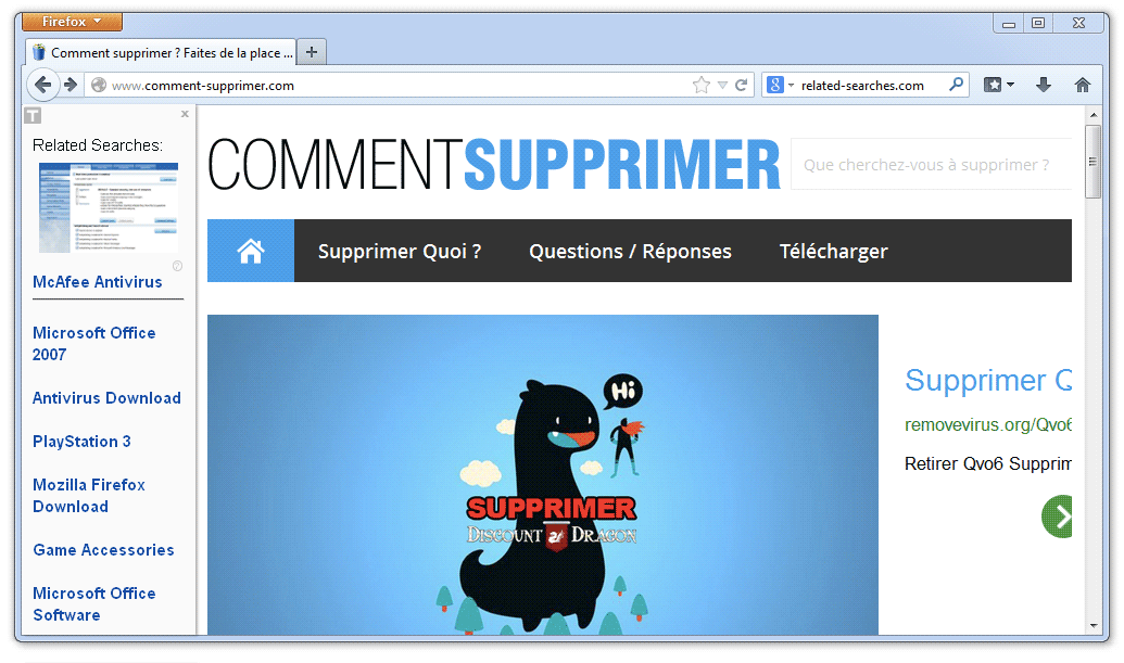Related Searches est une extension de navigateur qui va afficher une barre de publicité à droite des sites que vous visitez. Cette extension qui touche Chrome, Firefox et Internet Explorer est un spyware qui va analyser le contenu des pages que vous visitez pour vous proposer des liens sponsorisés. Très gênant pour la navigation puisqu’elle réduit l’espace destiné au sites que vous visitez, Related Searches pose donc aussi un vrai problème concernant le problème de la vie privée.