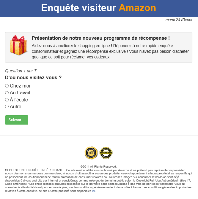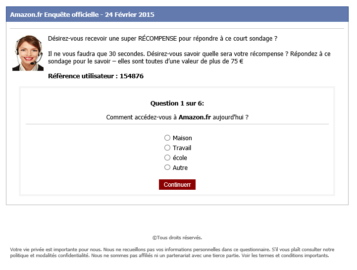 Vous étiez en train de faire des achats sur Amazon, une recherche sur Google ou en train d’envoyer un message sur Facebook à un ami et soudain une fenêtre s’ouvre vous indiquant que le site sur lequel vous étiez vous propose une enquête pour améliorer leurs services. En échange de vos réponses on vous propose toujours une récompense « exclusive ». Ces sondages sont proposées sur différentes urls qui change au fur qu’elles sont détectées par des programmes anti-malwares. Surveycamp.org, consumer-feedback.net, survey.com-annualsurvey.info, consumers-reviewing.com sont des urls qui affichent ce genre de sondages.